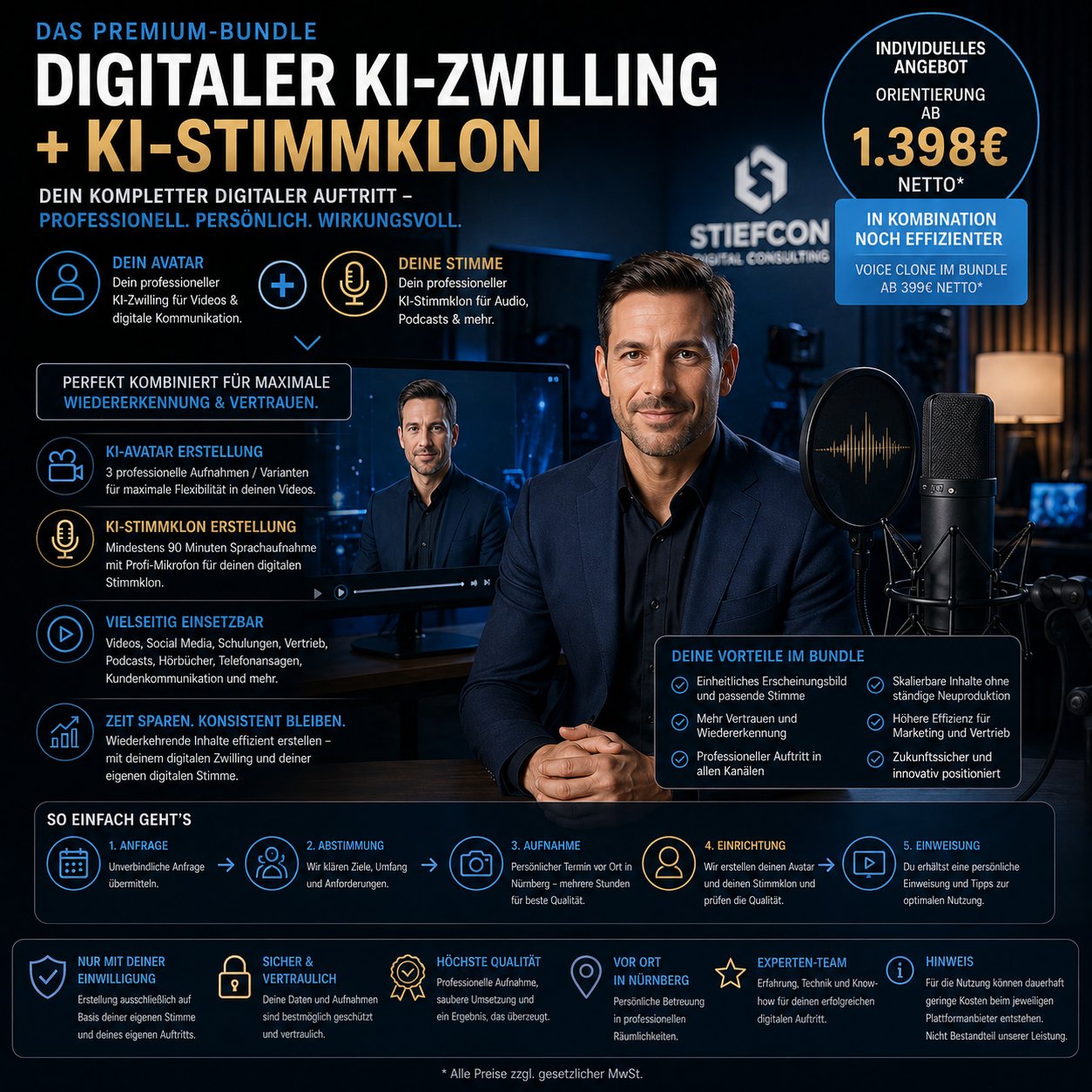 - KI-Stimmklon als Zusatz im Bundle: je nach Umfang ab 399 € netto / 474,81 € inkl. 19 % USt.